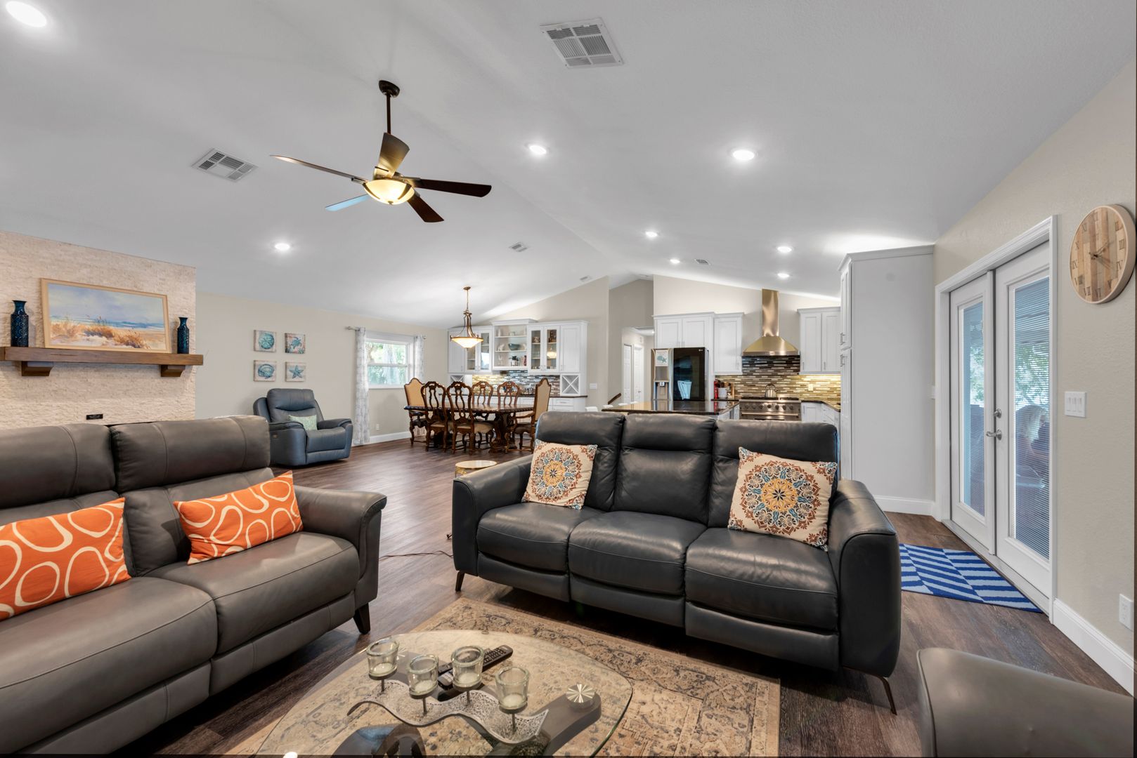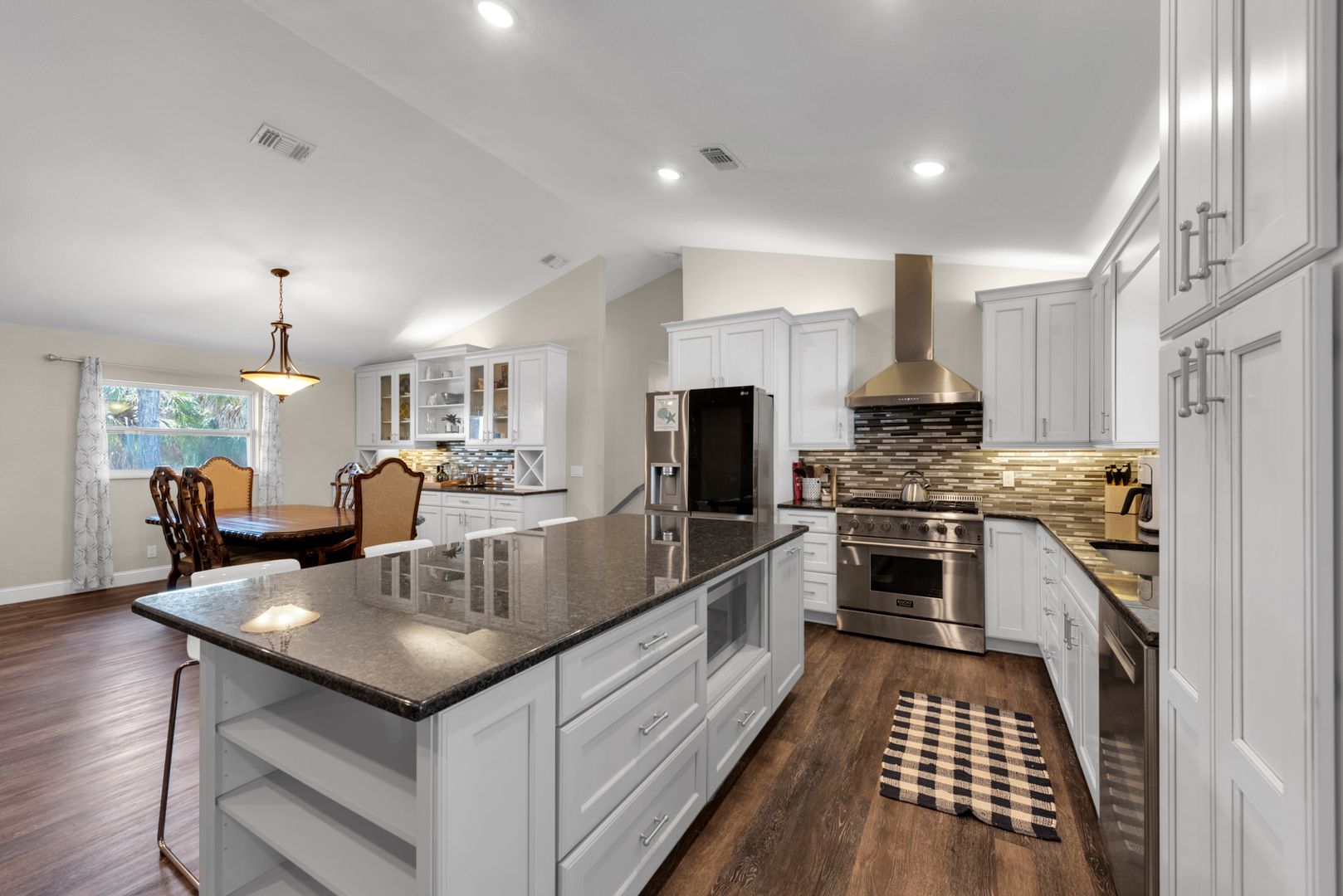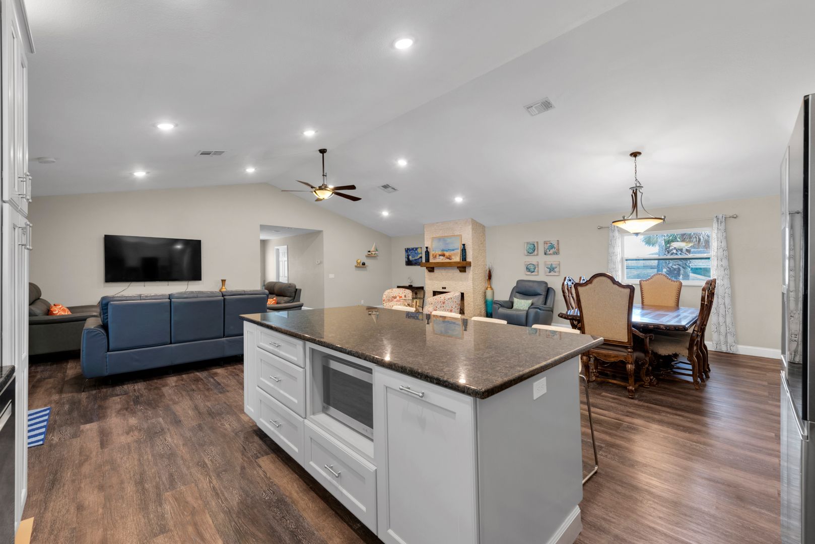 Step inside this fully remodeled home to find water views from every living area and bedroom. The open floor plan features a cathedral ceiling and recessed lighting, highlighting the combined kitchen, dining, and living areas. The kitchen is a chef's dream with new cabinetry, granite countertops, a large center island, tile backsplash, and quality stainless-steel appliances. French doors off the kitchen open to a screened-in porch, ideal for year-round entertaining and enjoying the water views.