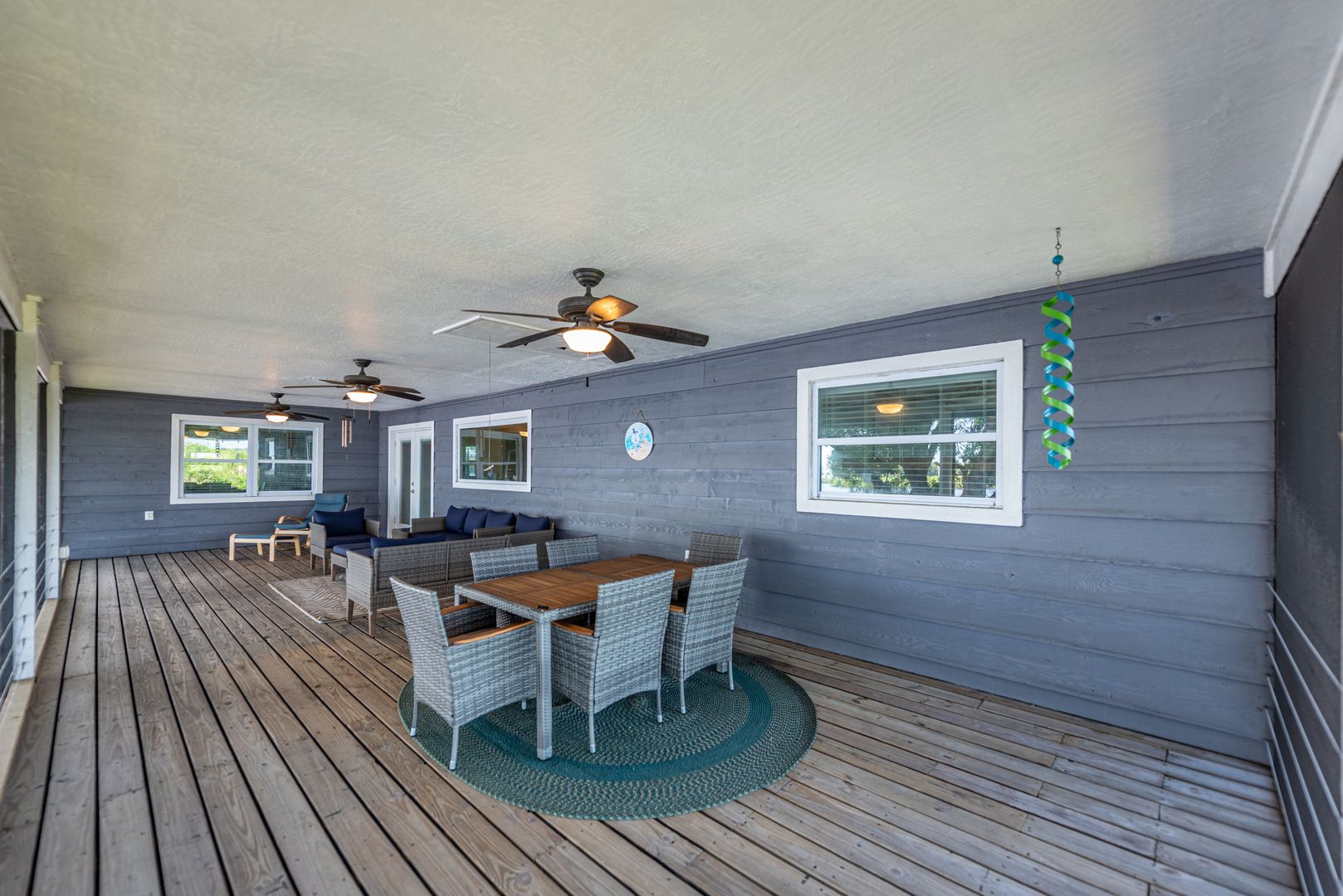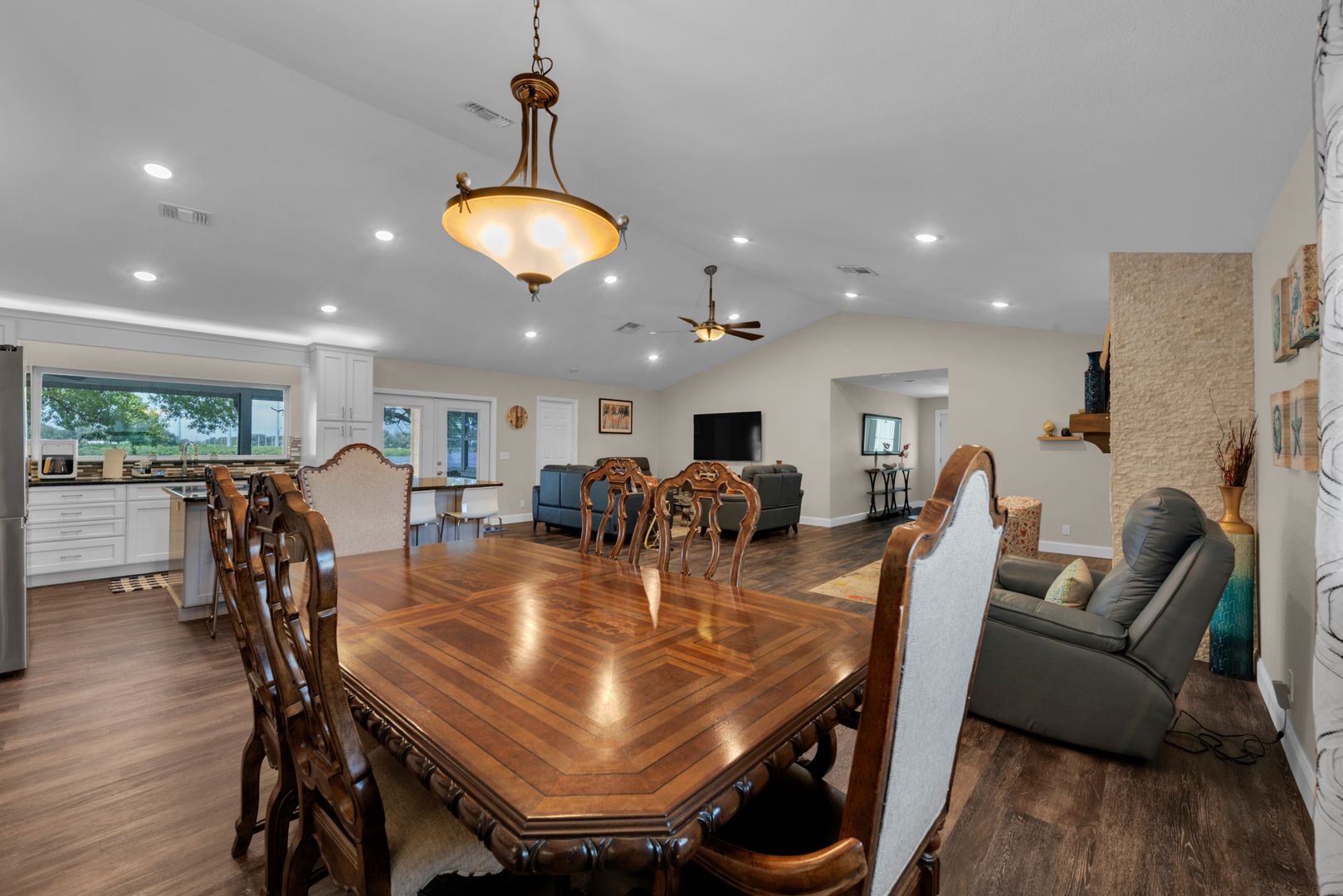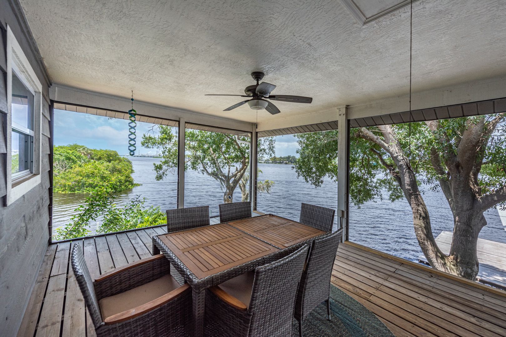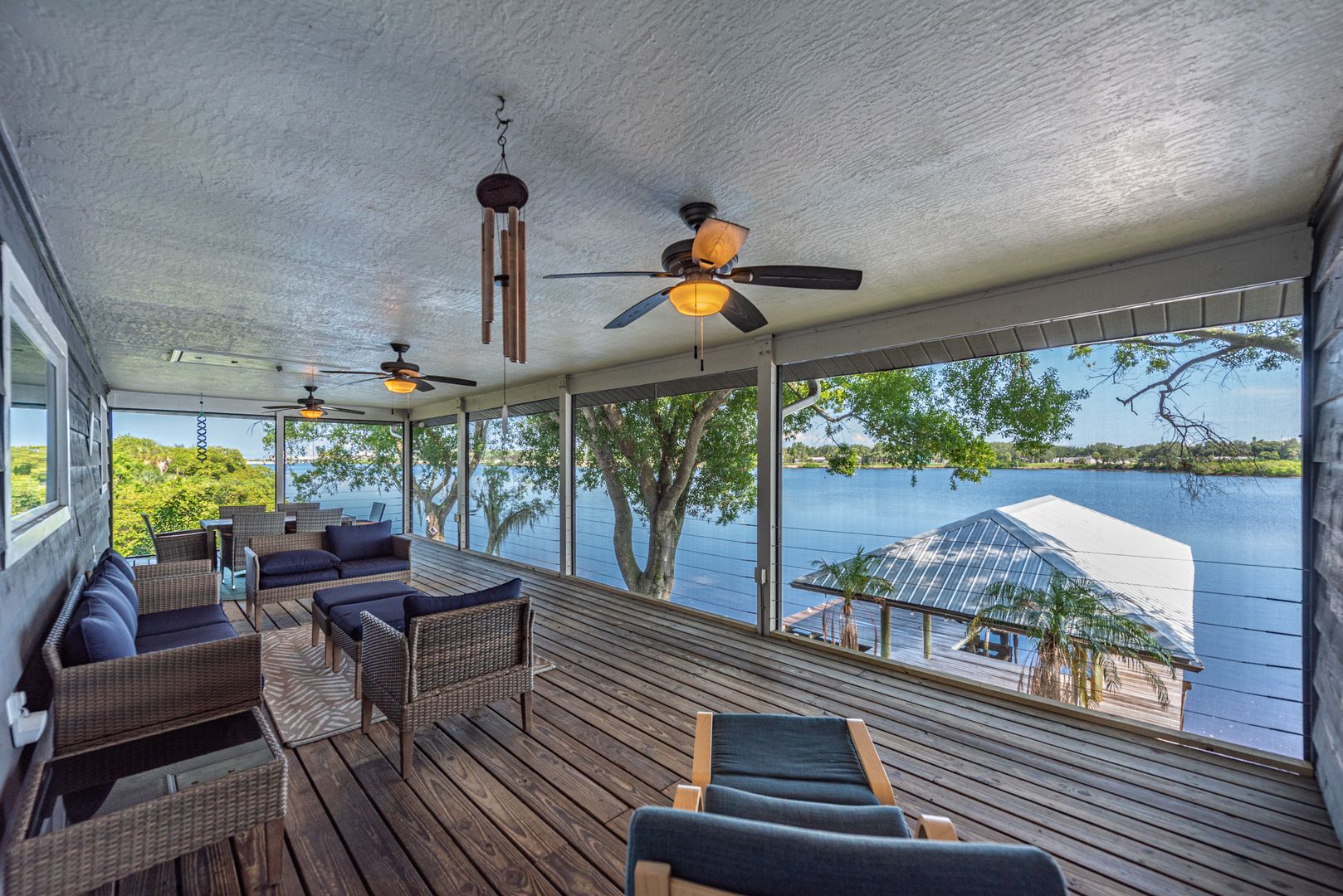 Step inside this fully remodeled home to find water views from every living area and bedroom. The open floor plan features a cathedral ceiling and recessed lighting, highlighting the combined kitchen, dining, and living areas. The kitchen is a chef's dream with new cabinetry, granite countertops, a large center island, tile backsplash, and quality stainless-steel appliances. French doors off the kitchen open to a screened-in porch, ideal for year-round entertaining and enjoying the water views.