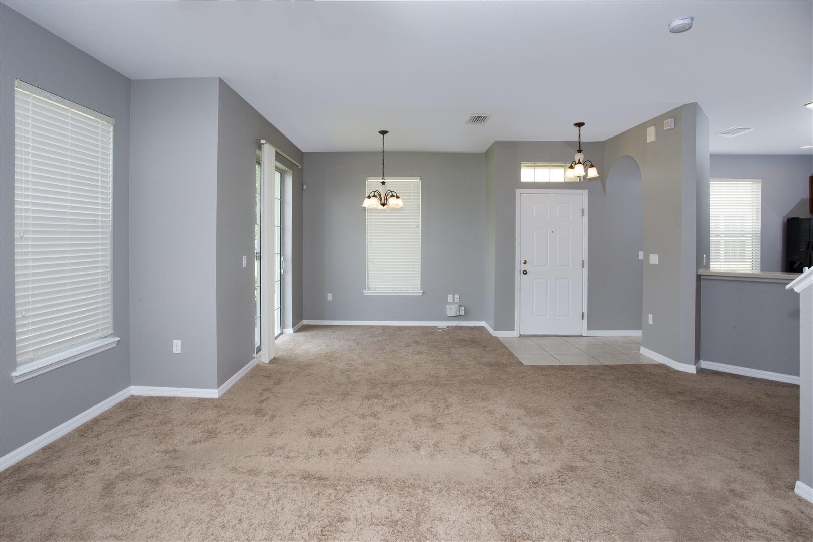 The kitchen features a breakfast bar overlooking the living area, closet pantry, and ample cabinetry for storage. The open-concept living and dining room combination offers abundant natural light and sliding glass doors leading to the backyard.