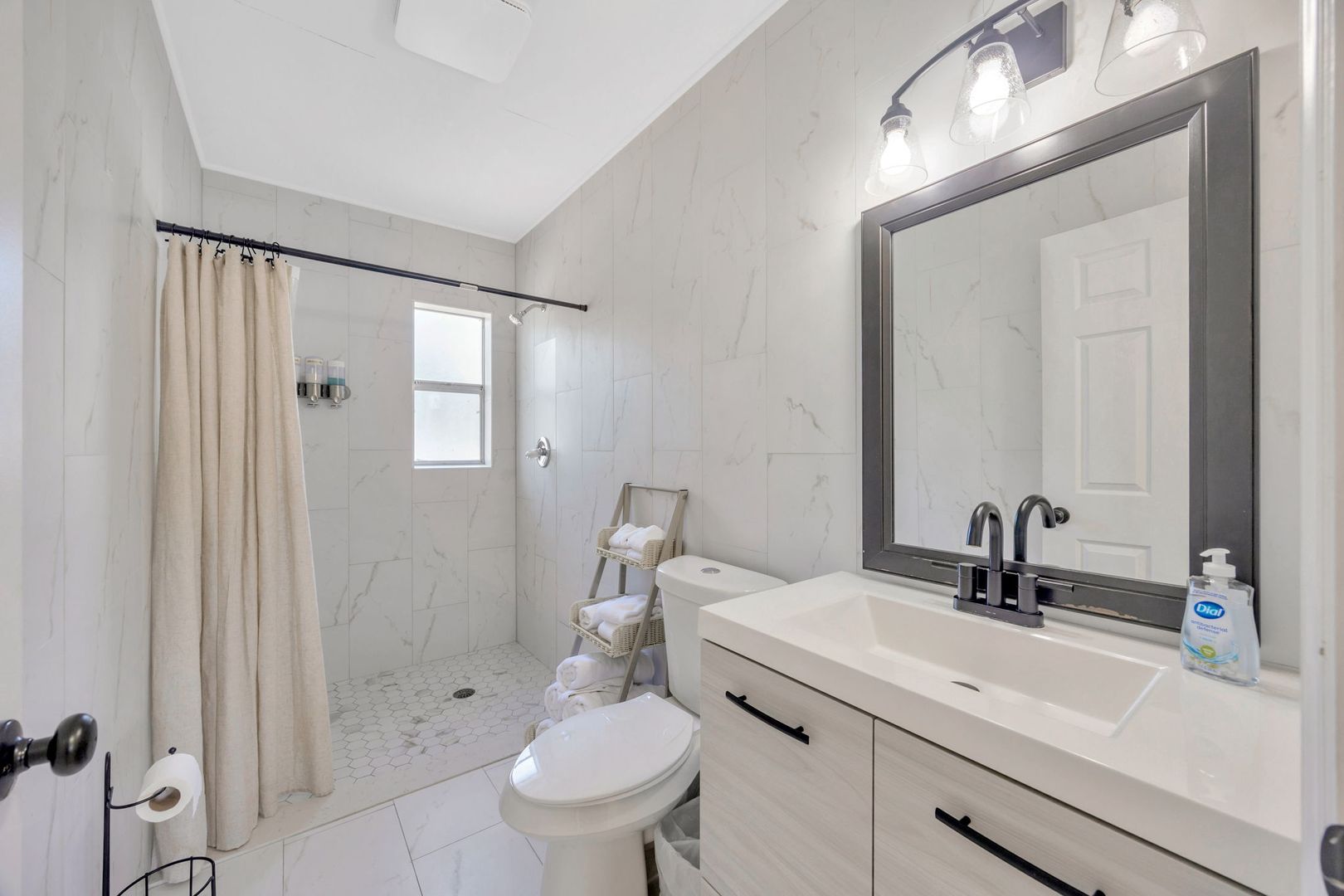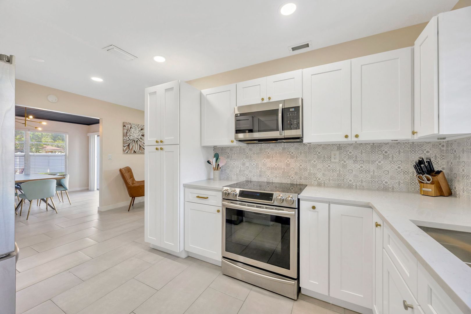 As you enter, you’re welcomed into a bright living room filled with natural light. To the left, you’ll find the kitchen and dining area, perfect for daily meals or entertaining. All three bedrooms and both bathrooms are conveniently located together on the right side of the home.