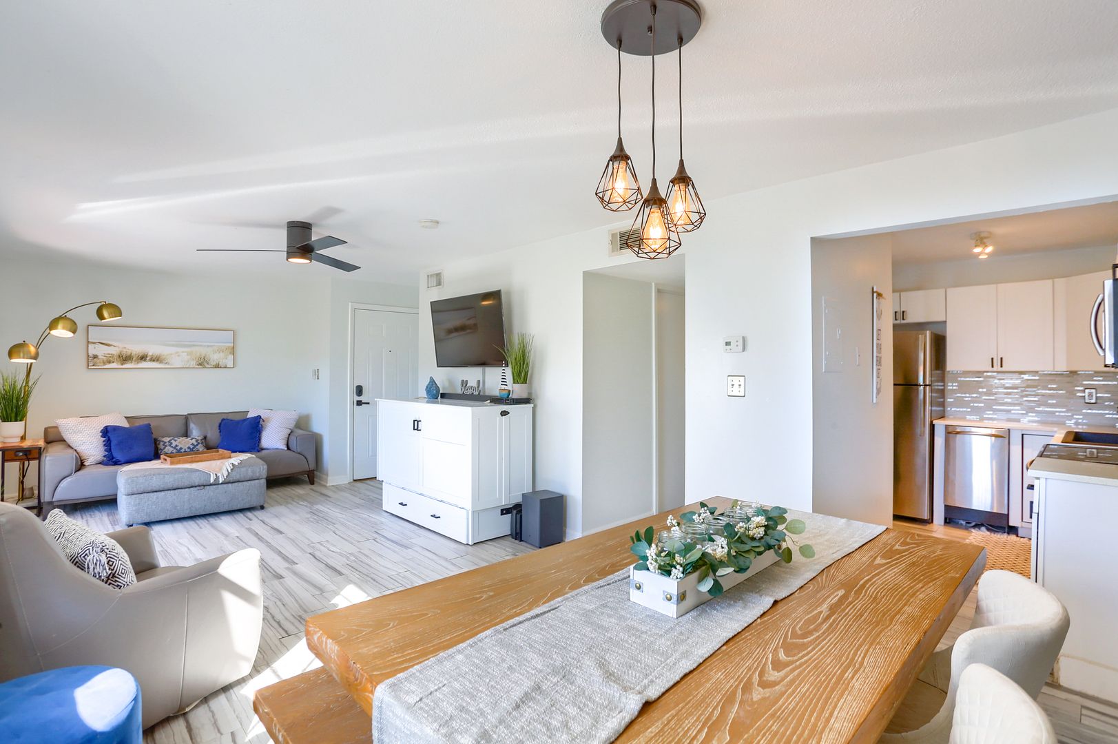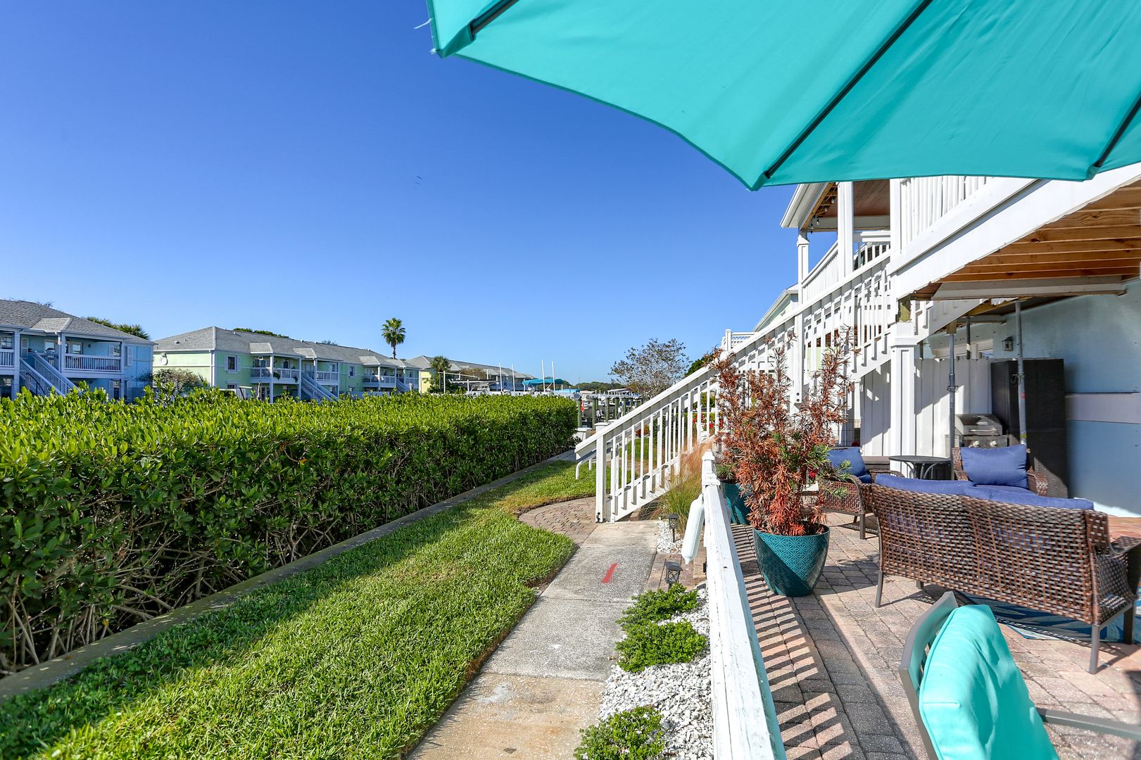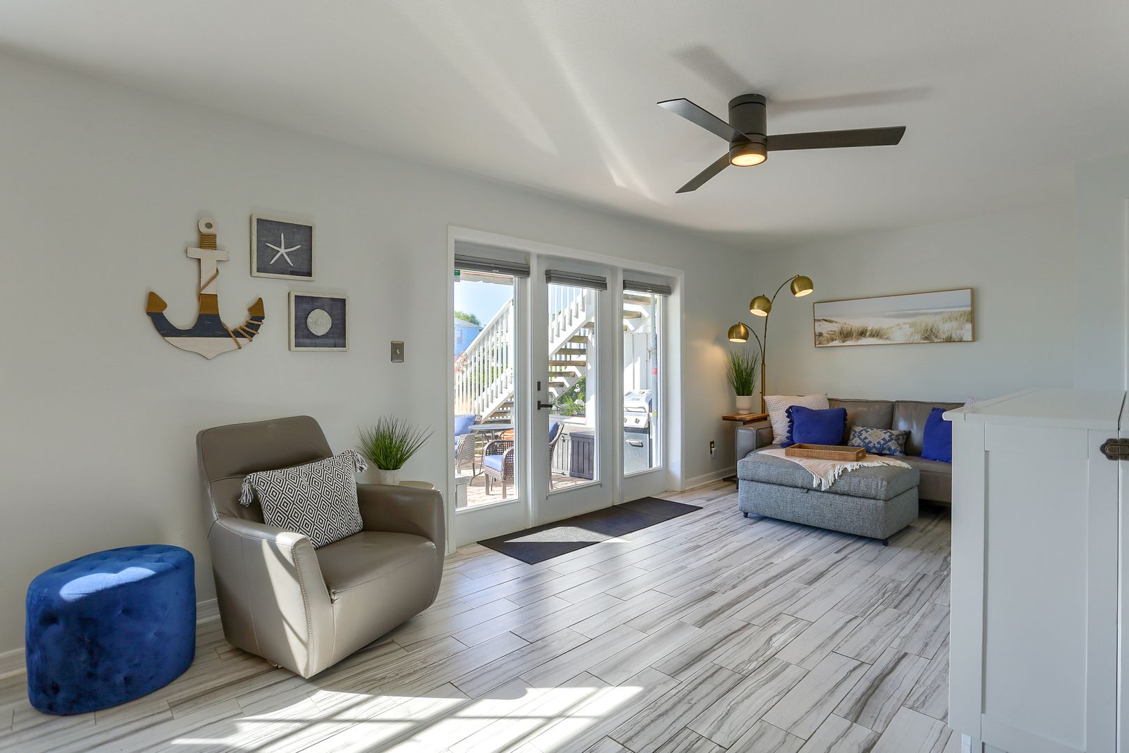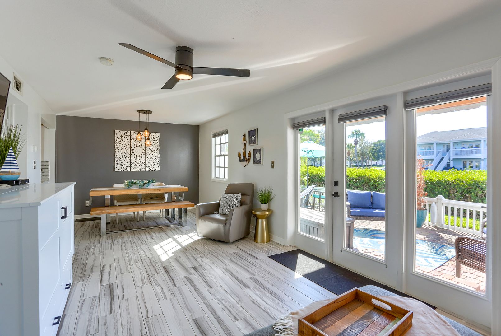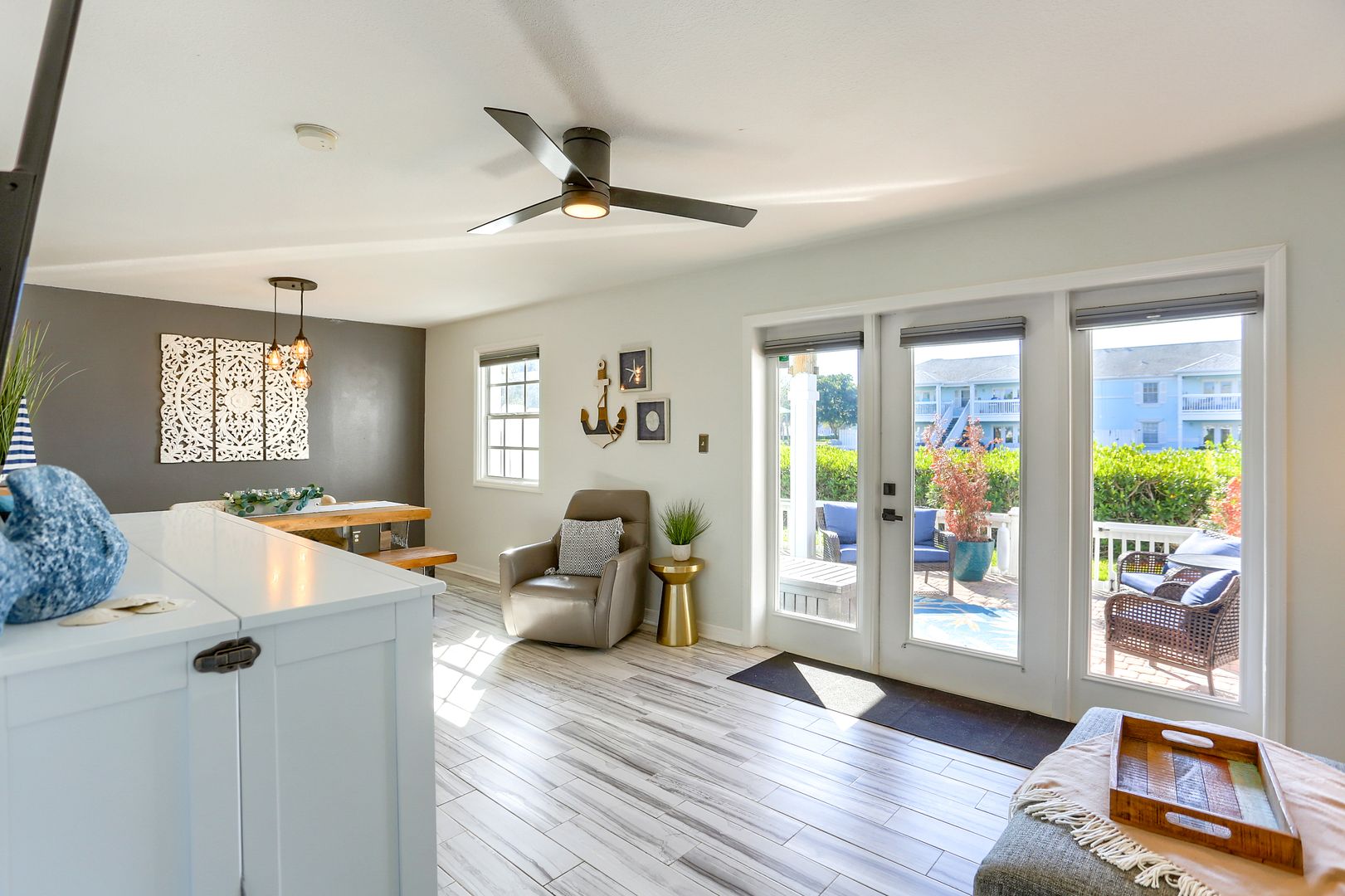 Your waterfront rental retreat awaits with a tastefully decorated interior featuring a primary bedroom with a king size bed, living area with a pull-out bed, updated kitchen, and bathroom, plenty of closet space, and a private patio. This unit comes fully furnished with linens, cookware, dishes, furniture, and all the comforts of home. Features include a newer AC, tile flooring throughout, quartz counters, shaker style cabinets, updated bathroom fixtures, ceiling fans, and a light modern feel.