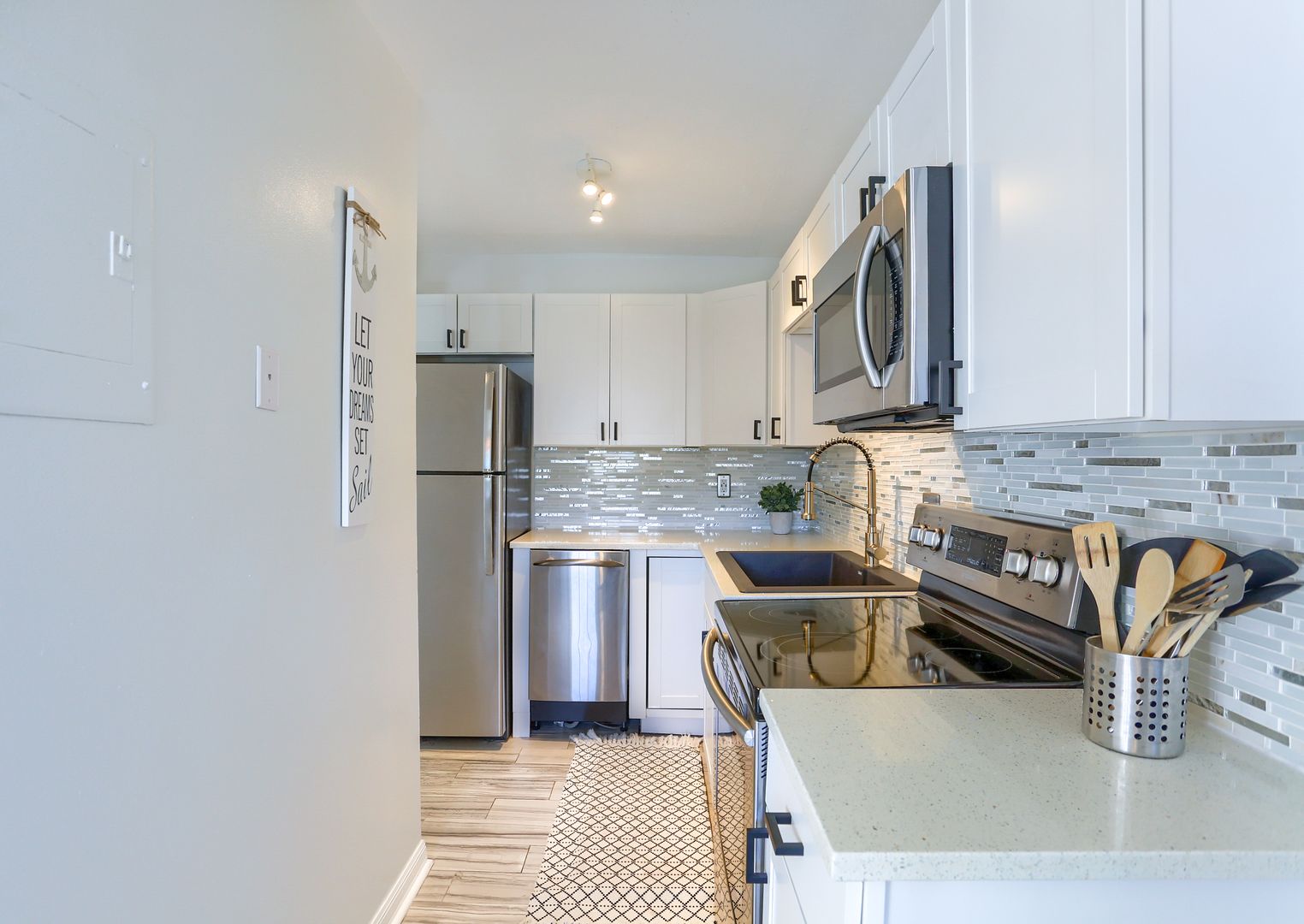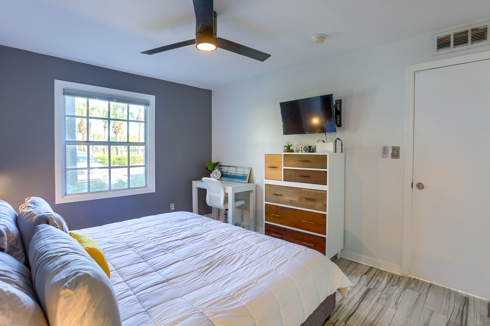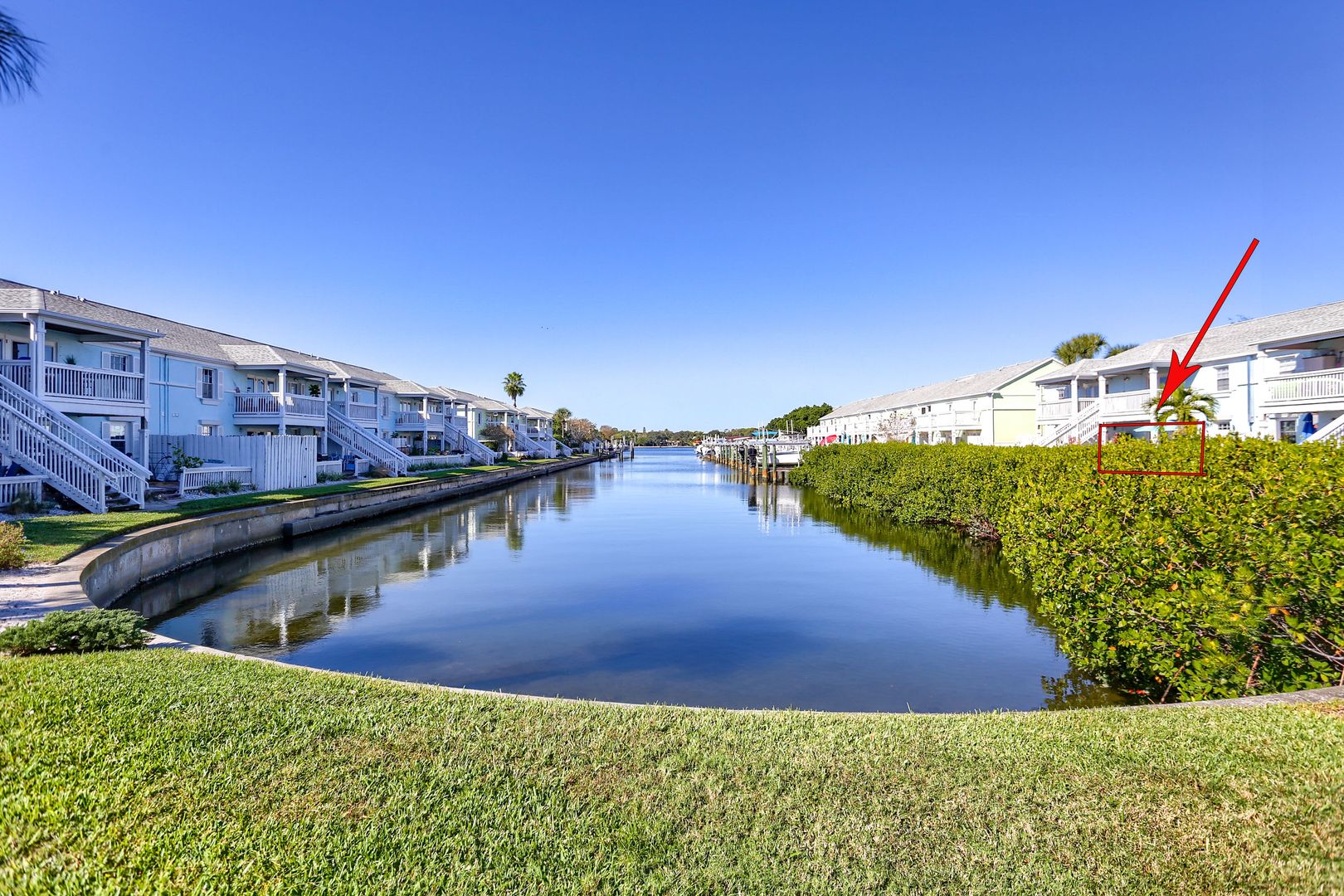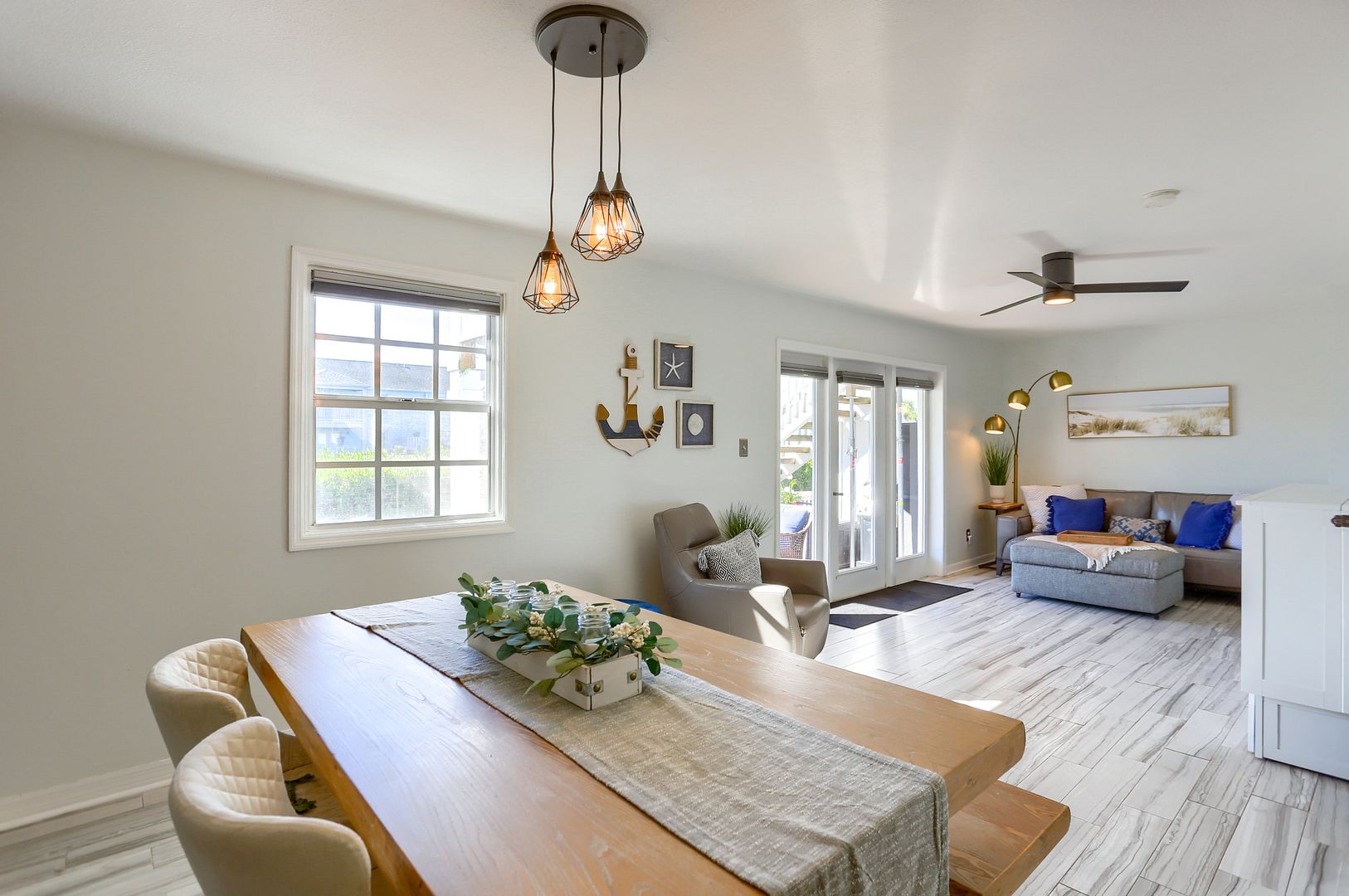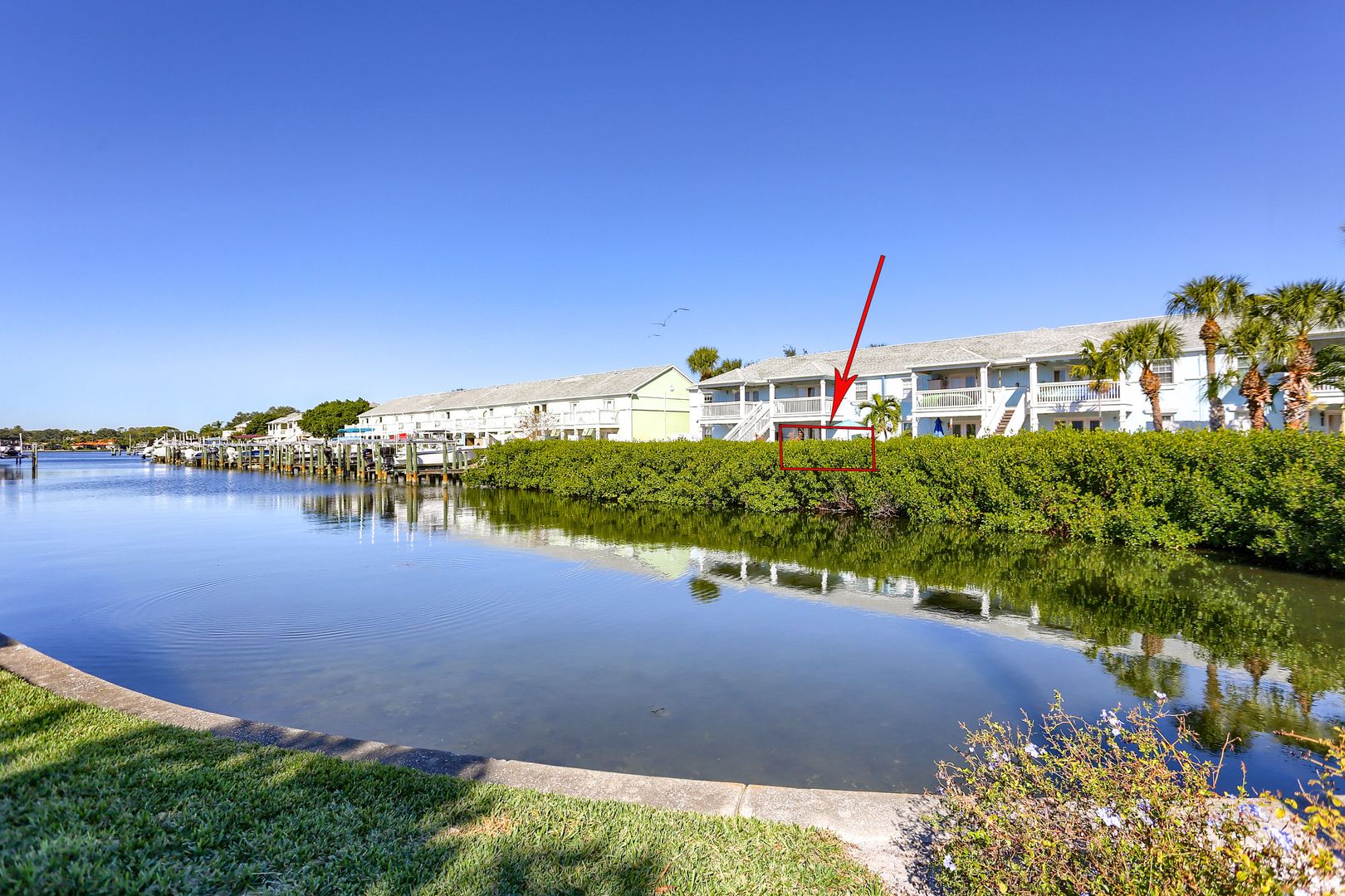 Your waterfront rental retreat awaits with a tastefully decorated interior featuring a primary bedroom with a king size bed, living area with a pull-out bed, updated kitchen, and bathroom, plenty of closet space, and a private patio. This unit comes fully furnished with linens, cookware, dishes, furniture, and all the comforts of home. Features include a newer AC, tile flooring throughout, quartz counters, shaker style cabinets, updated bathroom fixtures, ceiling fans, and a light modern feel.