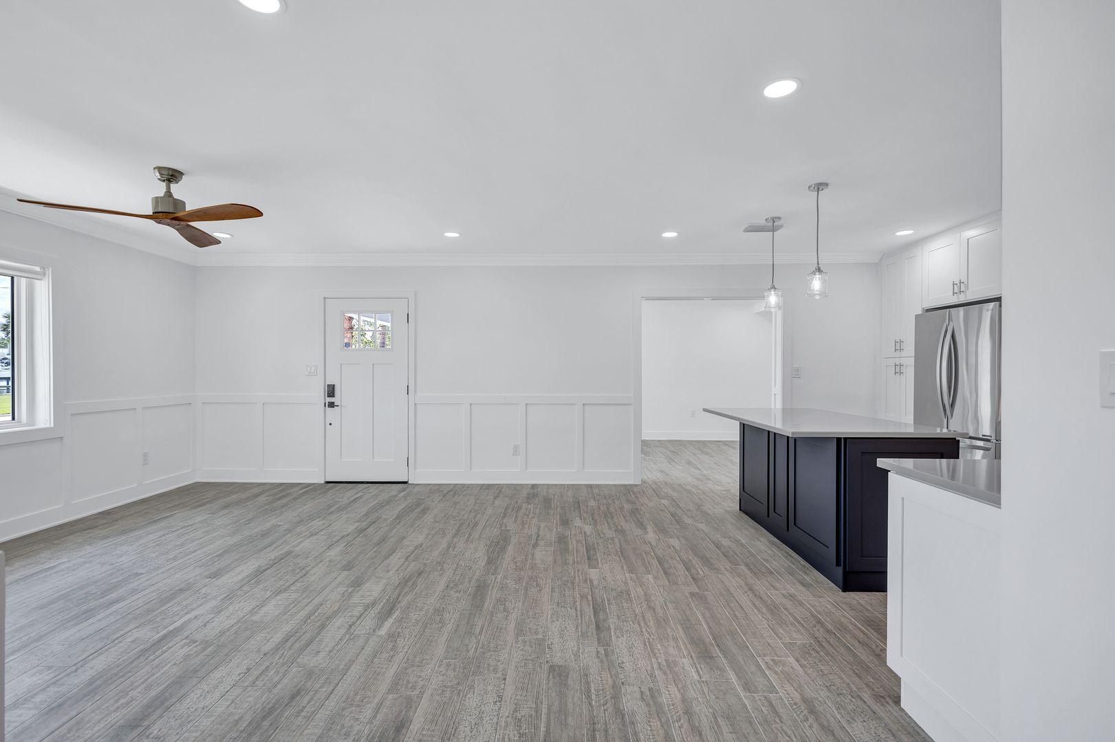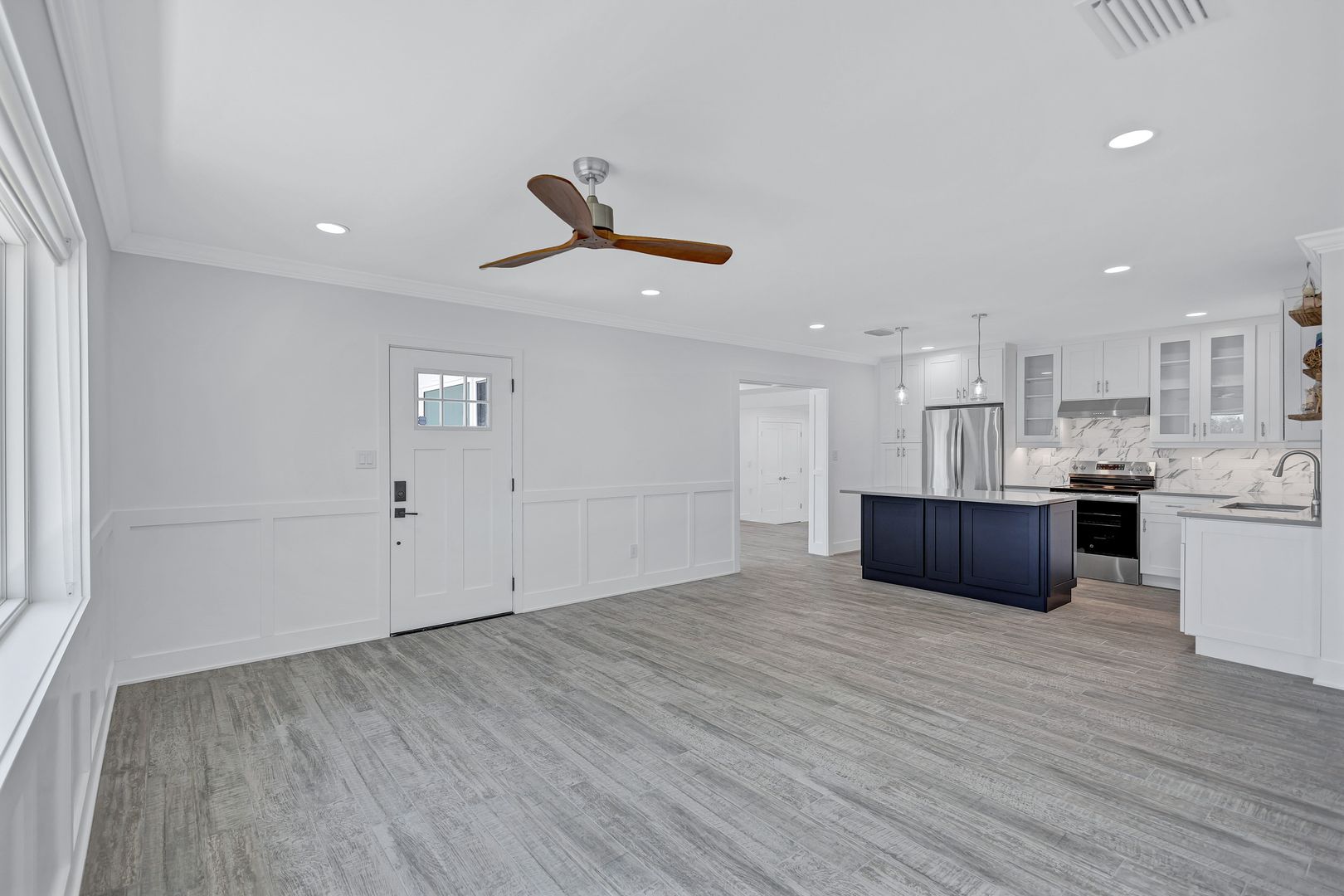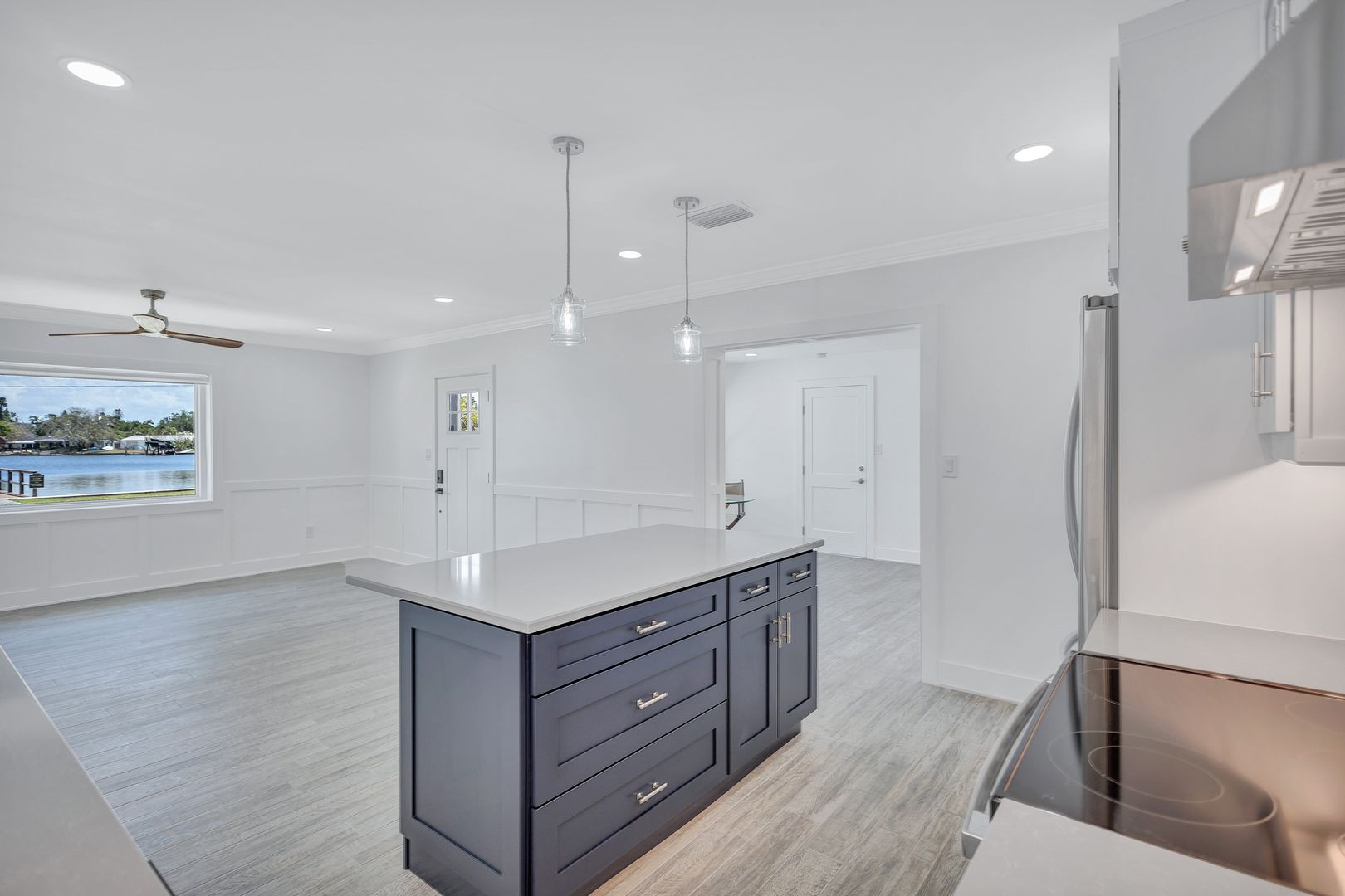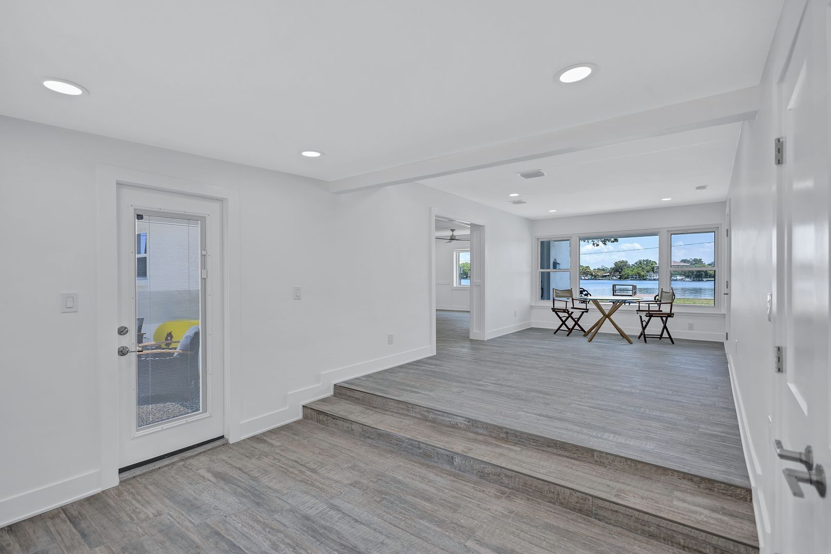 Features include a garage, 2 bedrooms and 1 bathroom along with a bright open-concept layout designed to maximize the waterfront setting. The renovated kitchen showcases a center island and new high-end appliances. Tile flooring and oversized windows fill the space with natural light, creating an airy coastal atmosphere throughout. Dual living areas provide a family room and additional space that can be used as a dining or living room that also includes a bonus space that would make a perfect work area.